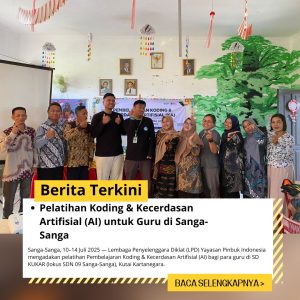 Dalam rangka meningkatkan kompetensi guru di era digital, Lembaga Penyelenggara Diklat (LPD) Yayasan Pinbuk Indonesia menyelenggarakan kegiatan pelatihan bertajuk “Pembelajaran Koding & Kecerdasan Artifisial (AI)”. Kegiatan ini berlangsung selama lima hari, mulai tanggal 10 hingga 14 Juli 2025, bertempat di SD KUKAR (lokus SDN 09 Sanga-Sanga), Kabupaten Kutai Kartanegara, Kalimantan Timur. Pelatihan dilaksanakan setiap hari dari pukul 07.30 hingga 16.00 WITA.