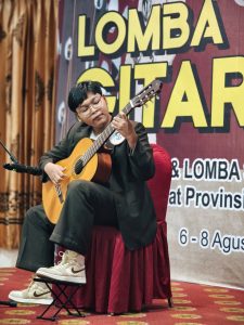 “Dengan penuh penghayatan, seorang peserta Lomba Gitar Solo FLS3N Tingkat Provinsi Kalimantan Timur 2025 memetik senar gitarnya di atas panggung. Setiap nada yang dimainkan menghadirkan harmoni indah, memadukan teknik, rasa, dan kepercayaan diri di hadapan dewan juri dan penonton.”